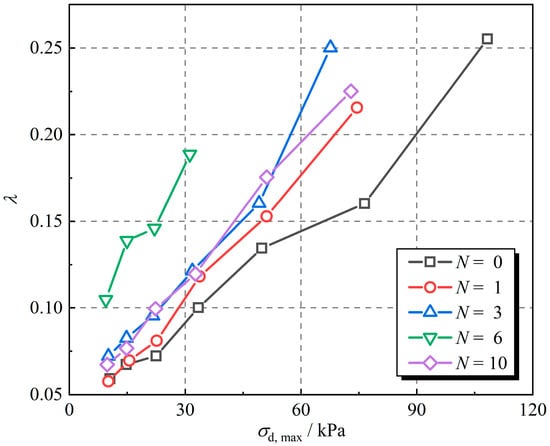 Figure 9 shows the variation in the damping ratio. The damping ratio increases approximately linearly as the dynamic stress amplitude increases. The regularity of the damping ratio is expressed in the following Equation (11):