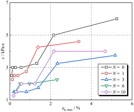 The viscosity coefficient of the linear viscous element is related to the damping ratio and reflects the ability of the material to dissipate energy. The greater the viscosity coefficient, the more energy is dissipated. Figure 11 shows the viscosity coefficient of the linear viscous element for different numbers of freeze–thaw cycles. The viscosity coefficient increases gradually as the dynamic strain amplitude increases. The sample without freeze–thaw cycles had the largest viscosity coefficient. The viscosity coefficients declined by 6.8%, 42.1%, 53.1%, and 21.4% after 1, 3, 6, and 10 freeze–thaw cycles, respectively, at a dynamic strain amplitude of 2%, in comparison with the sample without freeze–thaw cycles. As the number of freeze–thaw cycles increases, the viscosity coefficient of the linear viscous element decreases and then increases, reaching the minimum value at the 6th freeze–thaw cycle.
