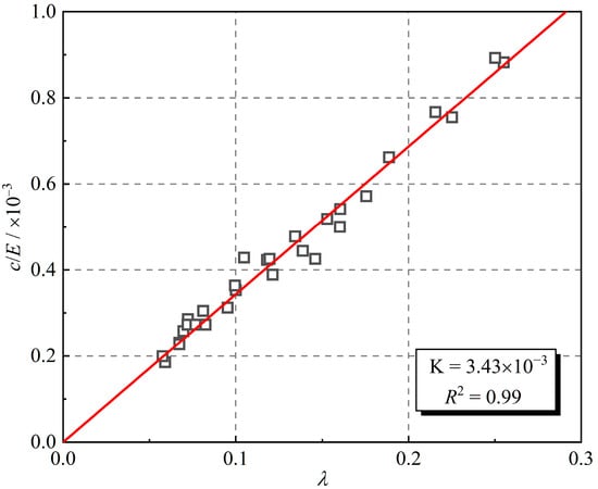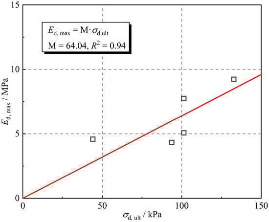 Table 2 shows the appropriateness of employing the hyperbolic model to describe the backbone curve. Figure 12 shows the relationship between ultimate dynamic stress and maximum dynamic elastic modulus. Analysis of the data shows that it can be considered that there is a positive proportional relationship between the ultimate dynamic stress and the maximum dynamic elastic modulus, as expressed in Equation (9):