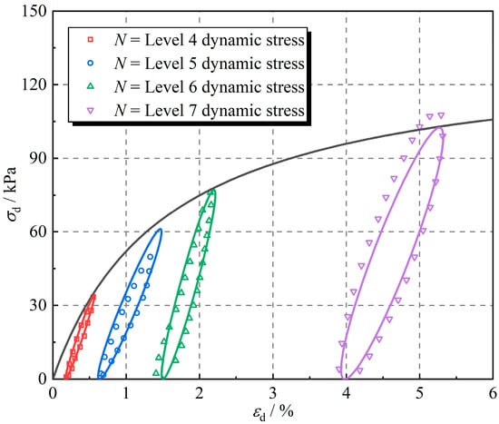 The 9th hysteretic curve for each level of dynamic stress is taken to analyze the dynamic response of rubber fiber-reinforced expansive soil. Backbone curves for different numbers of freeze–thaw cycles were obtained by connecting the vertices of the hysteretic curves. The backbone curves for different numbers of freeze–thaw cycles were obtained by connecting the vertices of the hysteresis curves, and the results are shown in Figure 3.