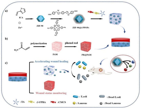 A schematic illustration of the preparation process of ZIF-90@i-PPOP–phenol red-based double-layered hydrogels for wound status monitoring and the acceleration of wound healing [75].