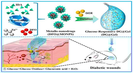 Schematics of the preparation of glucose-responsive metal–organic hydrogel and its working mechanism in terms of repairing diabetic skin wounds [91].