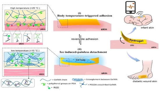 Motivated by hydrogen bonding’s reversibility at different temperatures, Jiang et al. [113] utilized the multiple interactions of polyphenol groups to design a temperature-sensitive skin-friendly hydrogel patch (Figure 3). When the hydrogel was in contact with human skin, the body temperature triggered the phase transition to achieve efficient and rapid adhesion and to keep the adhesion stable for a long time. After a simple cooling of the hydrogel surface, the molecular chains in the network regenerate hydrogen bonds, and the hydrogel adhesion decreases, realizing non-destructive peeling. In addition, the hydrogel patch gently adheres to the injured skin, providing a favorable environment for accelerating the healing process and thus controlling diabetic wounds.