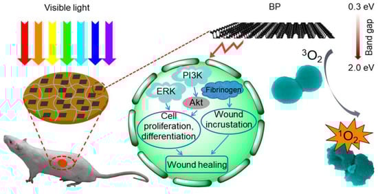A schematic illustration of the BP hydrogel-based accelerated healing of infected wounds under visible light irradiation [122].