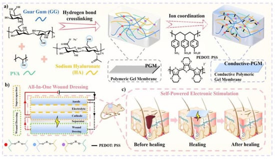One of the skin’s inherent properties is electrical conductivity, which speeds up the healing process by promoting keratinocyte migration, enhancing epithelial regeneration, directing angiogenesis, and modulating the expression of various factors. Conventional electrical stimulation (ES) methods do not cover the entire wound area and thus are detrimental to the wound healing process. Currently, the use of electroactive scaffolds combined with the application of electric fields to accelerate skin regeneration at the wound site is an attractive adjunct to wound care [130]. A conductive hydrogel wound dressing is one of the most common types of electroactive scaffold. It creates a physical barrier between the wound and the external environment, preventing microorganisms from invading the wound and reducing the risk of infection. Conductive hydrogels mostly contain an electroactive substance that covers the wound area and comes into contact with the skin underneath the wound, thus creating a circuit. This circuit efficiently transmits electrochemical and electro-biological signals to the cells within the affected tissue, resulting in a series of therapeutic responses. Lei et al. [131] prepared dynamically crosslinked conductive hydrogel dressings that fit perfectly into the cavity of deep wounds. In addition, the combination of exogenous ES therapy promotes cell-to-cell signaling and current transfer from external electrical stimuli, thereby promoting cell migration and angiogenesis.
