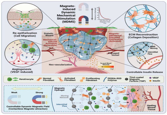 A schematic representation of magnetic hydrogel treated with magnetically induced dynamic mechanical stimulation for diabetic wound healing [108].