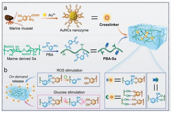 - Wang, T.Y.; Wen, M.Y.; Li, N.; Zhang, L.B.; Xue, Y.M.; Shang, L. Marine-Derived Nanozyme-Crosslinked Self-Adaptive Hydrogels for Programmed Regulating the Regeneration Process. Adv. Funct. Mater. 2024, 34, 2405257. [Google Scholar] [CrossRef]