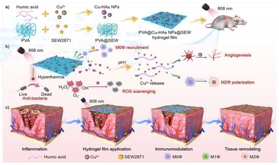 Multi-responsive hydrogels have also shown superior effects in terms of antimicrobial properties. Zha et al. [145] published an article in the journal ACS Nano on the preparation of near-infrared (NIR)/pH dual-responsive hydrogel thin films, with poly(vinyl alcohol) (PVA) serving as a substrate doped with humic acid (HA) and copper-ion chelated nanoparticles (Cu-HAs NPs) additionally loaded with the macrophage-recruiting agent SEW2871 (SEW), for the treatment of bacteria-infected skin wounds (Figure 9). The solubility of HAs is pH-responsive. They can form a dense structure to destroy bacteria in the early stage of the wound (acidic conditions), and then solubilize in the later stage as the pH increases to promote tissue regeneration. The Cu-HAs NPs act as a synergistic sterilizing agent that eradicates bacterial infections when irradiated with near-infrared light. The dual-responsive hydrogel film exhibits excellent antibacterial properties, with an inhibition rate of 97.06% against Escherichia coli (E. coli) and 99.42% against Staphylococcus aureus (S. aureus).