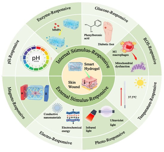 The healing of wounds is an ongoing process that might involve many phases or types of chronic wounds involving different physiological response processes [14]. Therefore, the future direction of hydrogel dressings involves creating intelligent hydrogels that report abnormalities in the healing process by detecting the wound status and reactively adjusting to alterations within the wound microenvironment. Smart hydrogels, also known as stimuli-responsive hydrogels, alter the physical properties or chemical structure of the hydrogel molecule by responding to small changes in different internal (e.g., pH, enzyme, glucose, and ROS responses) and external stimuli (e.g., temperature, light, electrical, and magnetic field responses) and by reflecting the corresponding functions [15,16,17]. Examples include achieving precise drug release on demand and avoiding the drug resistance seen due to the use of high doses of antibiotics [18]. Therefore, when constructing hydrogel wound dressings, more and more researchers are focusing on the preparation of smart hydrogels and the realization of functionally responsive modulation through the introduction of substances capable of stimulating and responding to alterations in the wound’s microenvironment in order to meet the requirements of various stages of wound healing and various wounds that are healing.