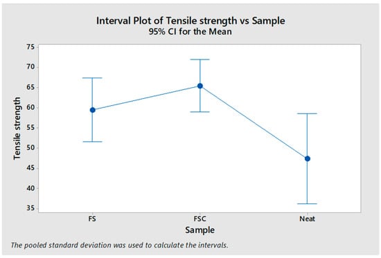 Figure 3 further illustrates the differences in the mean value of the tensile strength of the PU foam. The interval plot indicates that both FS and FSC significantly improve the tensile strength of polyurethane compared to neat PU. FSC, in particular, shows the highest tensile strength (65.43 ± 9.95 KPa), which is consistent with the literature indicating that collagen-based fillers enhance the mechanical properties of polymers. The confidence intervals further suggest that while there is some variability in the data, the trend of improved tensile strength with natural fillers is clear.