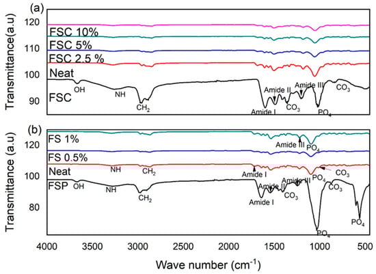 FTIR analysis revealed significant chemical interactions between PU and FSC, as evidenced by shifts in the N-H and C=O stretching peaks and the appearance of amide bands. These interactions suggest that collagen forms strong hydrogen bonds and enhances compatibility with the PU matrix, thereby improving the mechanical properties of the composites [29]. The minimal changes observed with FS indicate that its effect on the chemical structure of PU is limited, consistent with findings that low concentrations of natural fillers have negligible effects on polymer matrices [28].