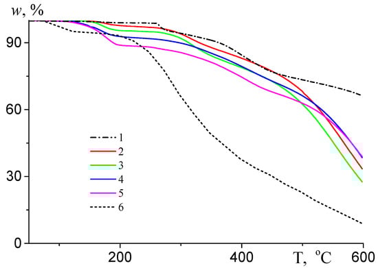 TGA curves of the AN copolymers with various content of TBA; fTBA = 0 (1), 1.0 (2), 2.5 (3), 5.0 (4), and 10.0 mol.% (5), and polyacrylic acid (6) recorded under an argon atmosphere at a heating rate of 10 K/min.