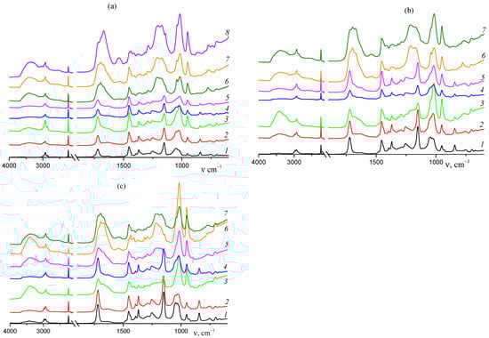 FT-IR spectra of AN–TBA copolymers synthesized from different monomer feeds before and after thermal treatment of their 5 wt % solutions in DMSO: fTBA = 5.0 (a), 7.5 (b), and 10.0 mol.% (c). (a) Conditions: room temperature (1), 3 h at 140 °C (2), 24 h at 140 °C (3), 2 h at 160 °C (4), 5 h at 160 °C (5), 24 h at 160 °C (6), 5 h at 180 °C (7), and 24 h at 180 °C (8); (b), (c) Conditions: room temperature (1), 3 h at 140 °C (2), 24 h at 140 °C (3), 2 h at 160 °C (4), 5 h at 160 °C (5), 24 h at 160 °C (6), and 5 h at 180 °C (7).