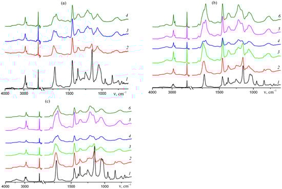 FTIR spectra of AN–TBA copolymers synthesized from different monomer feeds before and after thermal treatment of their films at 180 °C: fTBA = 5.0 (a), 7.5 (b), and 10.0 mol.% (c). Time: (a) 0 (1), 5 (2), 20 (3), and 40 min (4); (b), (c) 0 (1), 5 (2), 10 (3), 20 (4), 30 (5), and 40 min (6).