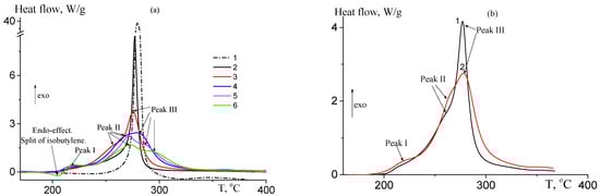 DSC was applied in the dynamic conditions of heating to investigate the thermal properties of AN–TBA copolymers. In an argon atmosphere, the cyclization of PAN results in intense heat release in the narrow temperature range (Figure 6a, curve 1). The incorporation of TBA units results in a shift in the temperature, at which exo-effect begins, to the lower-temperature region and a decrease in the intensity of heat flow (Figure 6a, curves 2–6, Table 4). An increase in the TBA content in the copolymers leads to a broadening of the temperature range of the exo-effect. The analysis of DSC curves of the copolymers reveals three peaks at ca. 220 (peak I), 260–270 (peak II), and 280–290 °C (peak III). Additionally, an endo-effect at ca. 200 °C is observed, which is more pronounced for the copolymer synthesized from the monomer mixture containing 10.0 mol.% of TBA. This endo-effect is attributed to the release of isobutylene from TBA units. Peak I may be assigned to the formation of an anhydride due to the reaction of carboxylic groups formed in situ after the release of isobutylene. Its locus on the temperature scale is independent of the TBA content in the copolymer, while the intensity of heat flow increases with an increase in TBA content in the copolymer (Figure 6a, Table 3). Peak II can be assigned to the ionic cyclization of nitrile groups by the carboxylic groups (Scheme 5). Peak III is due to cyclization initiated by a radical mechanism. This assumption is based on the results of our previous studies of the cyclization behavior of AN copolymers with acrylic acid [55,56]. A similar trend is observed for copolymers with lower MWs (Figure 6b). The temperature range corresponding to the reactions proceeding with exo-effect increases with the growth of TBA content in the copolymer, while TBA content has no visible impact on the total enthalpy of these reactions (Table 4).