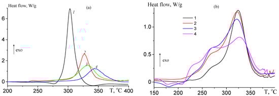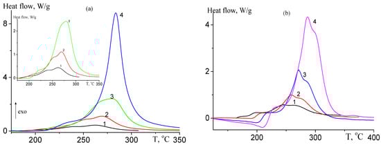 DSC thermograms of copolymers of AN–TBA synthesized from the monomer feed containing 5.0 (a) and 7.5 mol.% TBA and 0.05 mol.% ME (b). Heating rate 2.5 (1), 5 (2), 10 (3), and 20 °C/min (4); recorded in argon.
