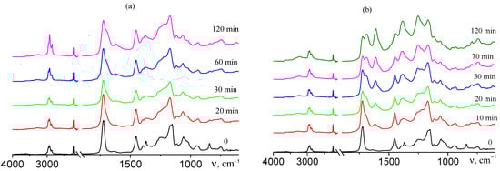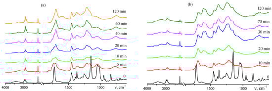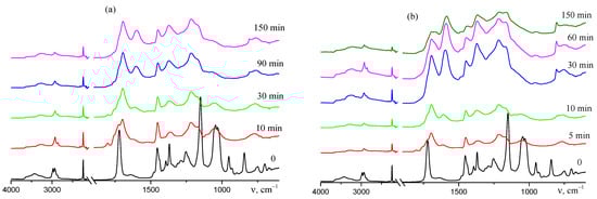 FTIR spectra of AN–TBA copolymers synthesized from the mixture containing 10 mol.% TBA and heated at 200 (a) and 225 °C (b) in argon for the required period, specified in the Figures.