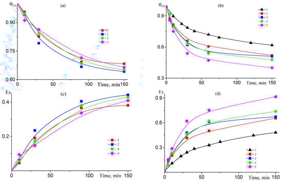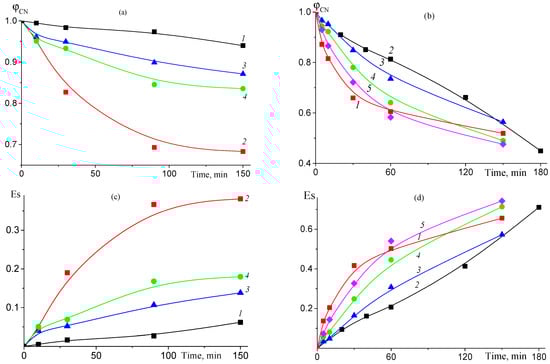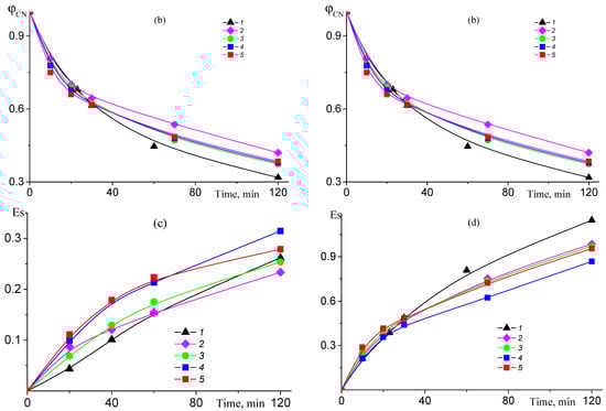The dependences of φCN (a,b) and Es (c,d) on the time of thermal treatment at 200 (a,c) and 225 °C (b,d) in air for AN–TBA copolymers synthesized from the mixture containing 10.0 mol.% TBA. (a,c) fTBA = 1 (1), 2.5 (2), 5 (3), and 10 mol.% (4); (b,d) fTBA = 0 (1), 1 (2), 2.5 (3), 5 (4), and 10 mol.% (5).