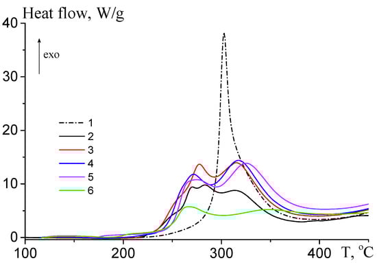 DSC thermograms of AN–TBA copolymers synthesized in the presence of 0.05 mol.% ME and different amounts of TBA; fTBA = 0 (1), 1.0 (2), 2.5 (3), 5.0 (4), 7.5 (5), and 10.0 mol.% (6). Heating rate 10 °C/min; recorded in air.