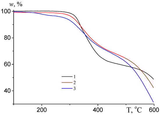 TGA curves of the AN copolymers containing 15 mol.% BA and various content of TBA, fTBA = 0 (1), 1.0 (2), and 2.5 mol.% (3), recorded under an argon atmosphere at a heating rate of 10 K/min.