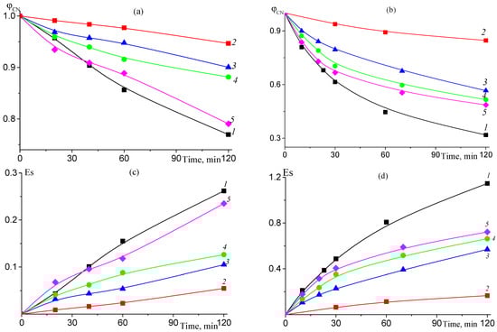 The dependences of φCN (a,b) and Es (c,d) on the time of thermal treatment at 200 (a,c) and 225 °C (b,d) in air for AN polymers: (a,c) PAN (1) and AN–BA–TBA copolymers synthesized from the mixture containing 15 mol.% BA and different amounts of TBA: fTBA = 0 (2), 1.0 (3), 2.5 (4), and 5.0 mol.% (5); (b,d). AN–BA–TBA copolymers synthesized from the mixture containing 15 mol.% BA and different amounts of TBA: fTBA = 0 (1), 1.0 (3), and 2.5 mol.% (4), and AN–TBA copolymer with 1 mol.% TBA (2).