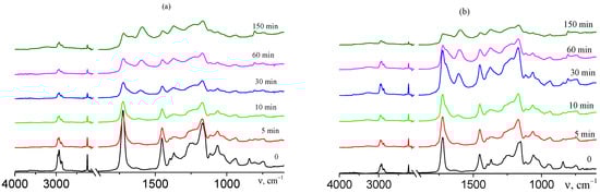 FTIR spectra of AN–BA–TBA terpolymers synthesized from the mixture containing 15 mol.% BA and 2.5 (a) and 5.0 mol.% TBA (b) and heated at 225 °C in air for the required period, specified in the Figures.
