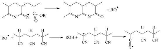 Among the monomers used in the production of PAN-based copolymers, alkyl acrylates, and in particular, methyl acrylate, are the most commonly used in the synthesis of binary and ternary AN copolymers [11,12,13,14,15,16,17,18,19,20]. Binary AN–alkyl acrylate copolymers can be prepared via radical polymerization in bulk [21], solution [22], emulsion [23], or precipitation polymerization in water [24]. In solution radical polymerization, AN is more reactive than alkyl acrylate, and the reactivity of alkyl acrylate in copolymerization with AN decreases as the length of the alkyl substituent increases [25]. Alkyl acrylates do not exhibit an accelerating or inhibiting effect on the cyclization rate, while they participate in the chain transfer reaction resulting in the break of the development of the ladder structure and the initiating of cyclization in another part of the macromolecule (Scheme 1) [25].
