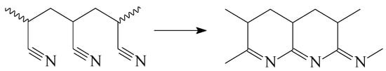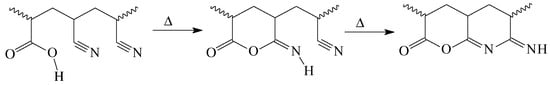 The content of acrylate groups in PAN-based copolymers used to produce carbon fiber precursors depends on the method of fiber molding. In wet spinning, the copolymer may contain any amount of alkyl acrylate comonomer. However, amounts of 1–5 mol.% is preferable for obtaining a low-defect fiber structure along with a high-molecular-weight polymer. In melt spinning, the melting point of pure PAN exceeds 300 °C, while the cyclization reaction (Scheme 2) takes place at a lower temperature (approximately 260–270 °C) before the melting process occurs [26,27,28,29]. Thus, direct melt spinning of high-molecular-weight PAN becomes impossible because of the cyclization reaction occurring below 300 °C and the polymer melting above this temperature.