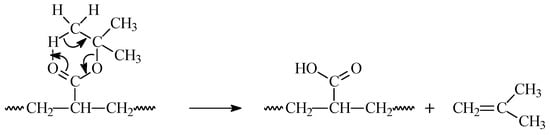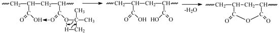 The mechanism of poly(tert-butyl acrylate) pyrolysis has been discussed in numerous papers [47,53,54]. The non-radical nature of the process was confirmed by pyrolysis of a sample of polymer in the presence of a radical spin-trap. The pyrolysis mechanism involves the formation of a 6-membered ring intermediated, which results in the release of isobutylene and the formation of polyacrylic acid (Scheme 3). However, the presence of nearby carboxylic groups may cause an autocatalytic pyrolysis reaction and even the formation of anhydride groups (Scheme 4).