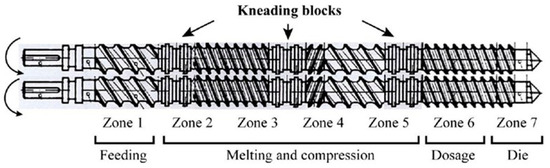 Heating zones and intermeshing configuration for the extrusion screws.