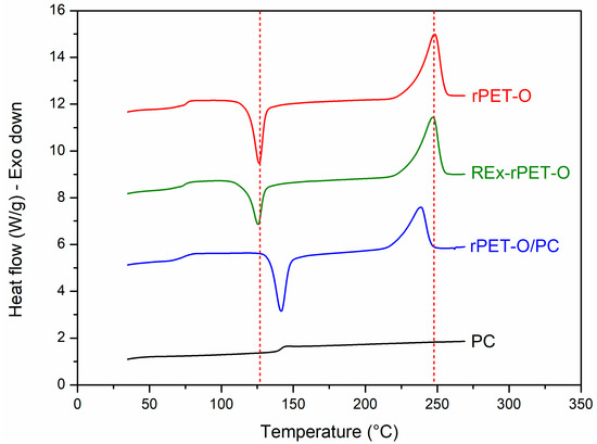 This copolymer, which acts as a compatibilizing agent for the possible surviving PC phase, promotes the crystallization ability of the system to be limited. Evidence of this effect is obtained by analyzing the cold crystallization process. The system requires a higher temperature during heating so that the growth of pre-existing crystals or nuclei that could not grow during cooling can be promoted by molecular mobility. Several authors have concluded that the crystallinity of PET decreases when blended with PC [11,41,42].