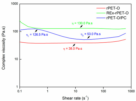 For the rPET-O/PC blend, while the complex viscosity remains lower than that of the REx-rPET-O system, it is still higher than that of rPET-O. This suggests the potential occurrence of transesterification between rPET-O and PC during melt blending, leading to the formation of a copolymer. However, the moderate increase in viscosity may imply that a portion of the polycarbonate did not fully react.
