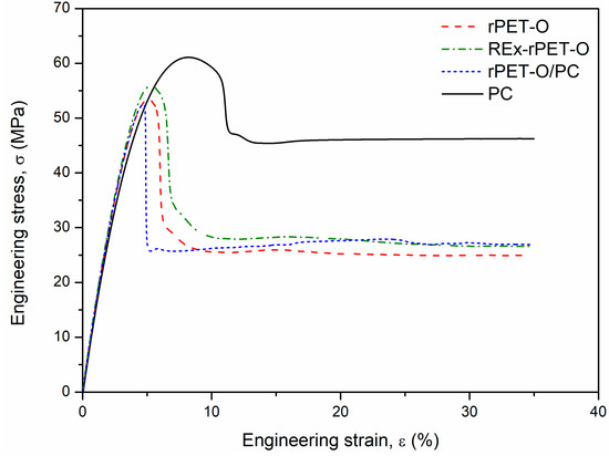 Focusing on the beginning of the plastic behavior (yield stress, σy), it can be seen that the rPET-O/PC system presents a decrease in σy (6%) and 15% of the deformation recorded at that moment εy compared to the rPET-O. Both values remain practically the same in the case of REX-rPET-O.