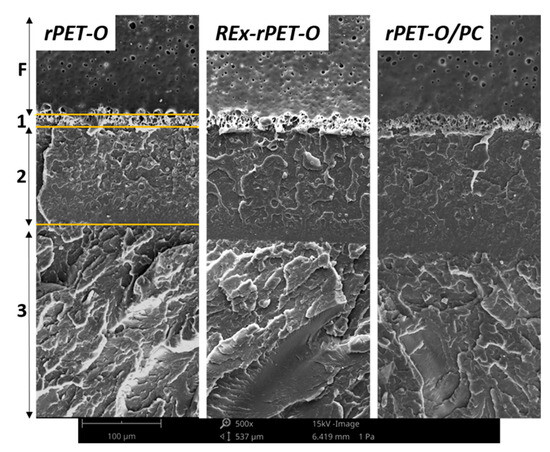 A detailed analysis of the initial region (near the sharpened pre-notch, see Figure 5) reveals that, for the two proposed modifications, the size of region 1–2 increases noticeably in length compared to rPET-O and is larger in the rPET-O/PC. This would imply that to reach propagation regime 3, a greater intensification of tensions is required.