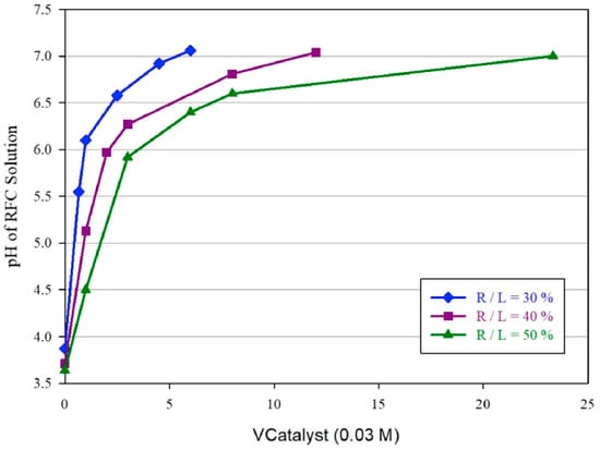 Carbon xerogels were prepared from resorcinol and formaldehyde in the presence of NaOH as a catalyst []. The output of the xerogels was studied using the response surface methodology (RSM) method. The capacitance and density of the carbon xerogels are dictated by parameters such as the pyrolysis temperature, pH of the solution containing the formaldehyde–resorcinol catalyst, and the ratio of the mass of reactants to the mass of the liquid (R/L). The relationship between the pH and the amount of catalyst is shown in Figure 1.