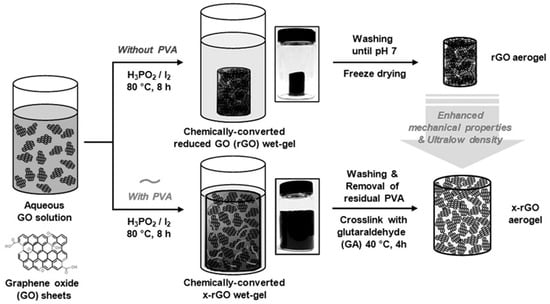 A highly elastic graphene aerogel was synthesized using an organized chemical approach []. A dispersion of aqueous graphene oxide was allowed to accumulate in a reduced graphene oxide (rGO) wet gel by chemical reduction. This was followed by freeze drying to obtain a dry rGO aerogel. The use of iodine and hypophosphorus acid during the chemical reduction process increases the p-p stacking interaction and reduces the electrostatic repulsion between the GO sheets in the wet gel []. Again, the rGO aerogel crosslinked with polyvinyl alcohol (PVA) was found to congregate in a different pattern because of the special interaction between the oxygen-containing functional groups of GO and the hydroxyl groups of PVA. Thus, the crosslinked rGO resulted in a higher porosity and a lower density than the simple rGO aerogel, which was unaffected during the freeze-drying and washing processes, as shown in Figure 2.
