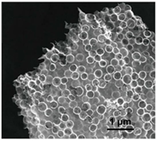 In one study [], an ink with high viscosity, composed of cellulose nanocrystals (CNC) and a silica microsphere suspension, was used in the direct ink writing (DIW) method for the 3D printing of multiscale porous carbon aerogels. The freeze-dried printed lattices were carbonized and activated using KOH, and the silica template was removed to furnish aerogels with varied thicknesses, periodic pore channels, and pores with diameters of 500 nm. The percolation of electrolytes deep into these aerogel-fabricated electrodes was feasible because of their open structures. Pores of 5–50 nm created during freeze-drying owing to ice sublimation boost electrolyte diffusion into the ligaments. The hollow carbon spheres were connected to each other to form carbon flakes in each ligament, as shown in Figure 3. The macropores formed in the hollows served as electrolyte reservoirs, thereby truncating the diffusion path of the ions. This results in the rapid accumulation of charges during the fast charging process. The surface area of the electrode was further improved by the generation of smaller pores via KOH activation. These aerogels showed good capacitance of 71 and 149 Fg−1 at scan rates of 200 and 5 mVs−1, respectively, in symmetric supercapacitors at a low temperature (−70 °C).