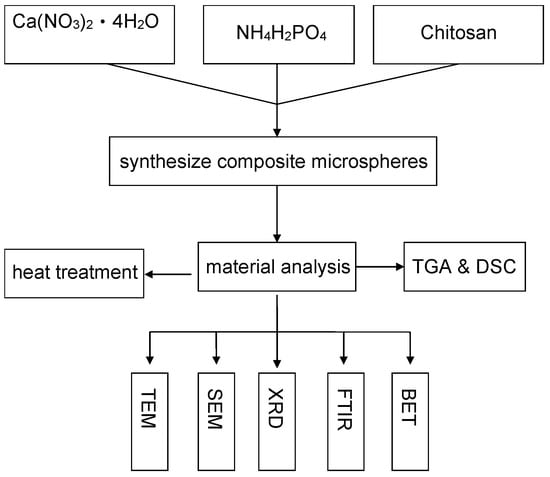 A composite solution was created by combining 0.042 M calcium nitrate (Ca(NO3)2·4H2O) and 0.025 M ammonium dihydrogen phosphate (NH4H2PO4), ensuring a Ca/P ratio of 1.67 for the calcium phosphate (CaP) solution. Subsequently, both the CaP solution and the 1 wt.% chitosan solution were heated to 65 °C in a water bath for an hour. They were then mixed and maintained at 65 °C for an additional half hour. During this time, white precipitates gradually settled. These precipitates were collected using a filter and subsequently subjected to 24 h of drying in an oven at 50 °C. Finally, the prepared samples underwent annealing at temperatures of 150, 300, 500, and 700 °C to investigate potential phase transformations. The experimental workflow is visually represented in Figure 2.