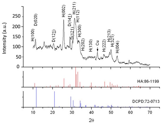 The XRD diagram of Chi-CaPM is shown in Figure 3 and was also compared with the ICDD card No. 86-1199 and No. 72-0713 peaks. The diffraction peaks of crystal planes were 10.842° (100), 25.883° (002), 31.792° (211), 32.206° (112), 32.929° (202), 46.726° (222), 49.508° (213), 50.523° (321), and 53.220° (004) of hydroxyapatite. Also, the diffraction peaks at 11.65° (020), 20.948° (121), 29.296° (141), and 30.543° (121) of DCPD were detected. The higher background intensity from 10° to 30° is a result of the amorphous nature of chitosan.