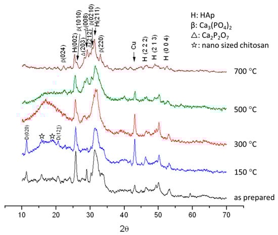 The XRD pattern of specimens annealed at 150, 300, 500, and 700 °C is shown in Figure 4. When heated at 150 °C, there are two weak peaks and one broad peak from 15° to 20°, where the peaks at 16° and 19° represent nano-sized chitosan []. When heated at 300 °C, the intensity of the broad peak becomes stronger, due to amorphous structures caused by the condensation of OH and/or NH bonds. Moreover, no post-annealed sample exhibited a broad peak; it was weaker than the heat-treated sample. There is no broad peak from 15° to 20° at 500 °C and 700 °C because of the complete oxidation of the dehydrated and/or condensed chitosan. The DCPD peak vanishes, and Ca2P2O7 (pyrophosphate) appears at 300 °C, signifying the transformation of DCPD into DCPA and initiating the transformation into Ca2P2O7, as depicted in reactions (1) and (2). At 500 °C, reaction (3) initiates to form β-TCP. Finally, the crystallinity of β-TCP is further enhanced at 700 °C: