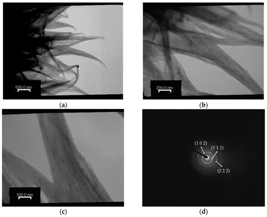 The TEM observations of Chi-CaPM after annealing at 500 °C for one hour are shown in Figure 7. The grass-like edge transforms into a rod shape. Like Figure 6d, its SADP exhibits a ring-shaped diffraction pattern from the (102) planes of hydroxyapatite and two pairs of arc-shaped diffraction patterns from the (111) and (222) planes of hydroxyapatite.