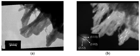 TEM images of the Chi-CaPM treated at 700 °C at 50,000× magnification (a) in bright field and (b) dark field conditions including the SADP.