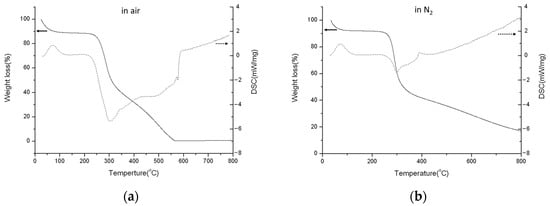 The TGA/DSC diagrams of chitosan carried out in air or N2 are shown in Figure 9a,b. From Figure 9a, they reveal three steps of weight loss. The first step, accounting for about 12% of the loss, is the evaporation of H2O, corresponding to the endothermic peak below 100 °C in the DSC diagram. The second step, involving a loss of about 42% at around 300 °C, results from the dehydration and/or condensation of chitosan, and this corresponds to the exothermic peak at around 300 °C. The third step is the further oxidation of the dehydrated and/or condensed chitosan in the air, corresponding to the exothermic region from 350 °C to 600 °C in the DSC diagram. These results are completely consistent with those discussed in the XRD as shown in Figure 3, Figure 4 and Figure 5. It is evident that the weight loss rate above 300 °C in N2 is slower than in air, primarily due to less oxidation in N2 as shown in Figure 9b.