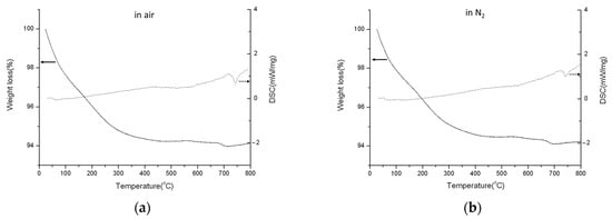 In this temperature range, there are no obvious endothermic or exothermic peaks until the temperature up to 700 °C in the DSC diagram. The exothermic peak around 700 °C corresponds to reaction (4). Additionally, a slight weight loss is observed in the TGA diagram, ascribed to the dehydration in reaction (4). There is no noticeable difference between the diagrams in air and in N2 because there is no oxidation occurring for HAp.