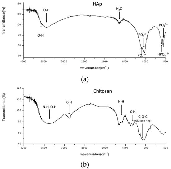 The FTIR spectra of HAp, chitosan, and the prepared Chi-CaPM microsphere are shown in Figure 12a–c. In the spectrum of HAp shown in Figure 12a, OH groups are found at wavenumbers in the range of 3600 to 3150 cm−1 and an explicit peak at 3570 cm−1. The wavenumber at 1650 cm−1 corresponds to H2O bending, which is different from the peak of CO32− (1460–1530 cm−1) []. Phosphate absorption bands at 1092, 1033, 964, 606, and 564 cm−1 are characteristics of a typical FTIR spectrum for HAp. The wavenumbers at 3300~3500 cm−1 (N-H and/or O-H), 2800~2900 cm−1 (C-H), 1590 cm−1 (N-H), 1382~1413 cm−1 (C-H), and 1160~1040 cm−1 (C-O-C, glucose ring) corresponding to the characteristics of chitosan are shown in Figure 12b. It was found that the chemical bonding of the prepared Chi-CaPM, as shown in Figure 12c, is a combination of HAp and chitosan, revealing both the absorption peaks of HAp and chitosan.