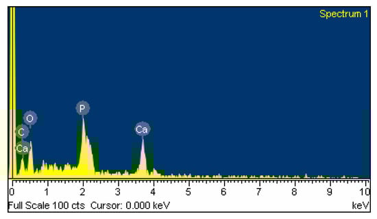 The EDS spectra indicate that the microsphere is mainly composed of C, O, P, and Ca elements, as shown in Figure 13. Their detailed contents are listed in Table 1. The ratio of Ca to P is 1.43. This means that the calcium phosphate in the composite microsphere is composed of 64.5% HAp and 35.5% DCPD. Combining TGA/DSC in Figure 9 and Figure 11, the composite sphere is entirely composed of 16% chitosan, 29.8% DCPD, and 54.2%.