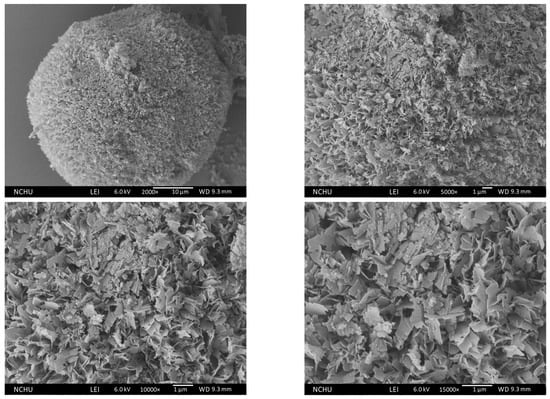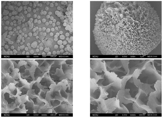 The SEM observation of Chi-CaPM is shown in Figure 14. It was found that Chi-CaPM is full of pores assembled by petal-like flakes. The average granularity of porous Chi-CaPM is about 25 μm, as shown in the upper two, and the pore size on the surface is about 0.7 μm, as shown in the lower two. From the higher magnification TEM image, the petal-like flakes are composed of several nano-sized rods, as shown in Figure 6.