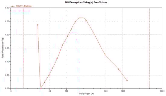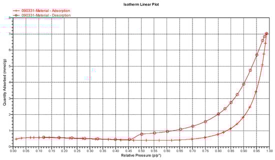 The BET nitrogen adsorption/desorption isotherm is shown in Figure 19. The typical hysteresis loop is usually found in multi-layer adsorption. Four characteristic adsorption curves are illustrated in a prior report []. The H1 type results from clustered invariant spheres constituting material with porosity. H2 is not defined clearly now, as various factors could be considered. H3 is the result of porosity assembled by micro flakes, and the H4 hysteresis loop is created by a narrow aperture []. The hysteresis loop of the microspheres in this study reveals the BET nitrogen adsorption/desorption isotherm, like H3, as shown in Figure 19.