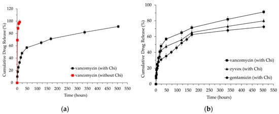 The cumulative drug release of (a) V-Chi-CaPM with (black one) and without (red one) additional chitosan and (b) V-Chi-CaPM, Z-Chi-CaPM, and G-Chi-CaPM with additional chitosan.