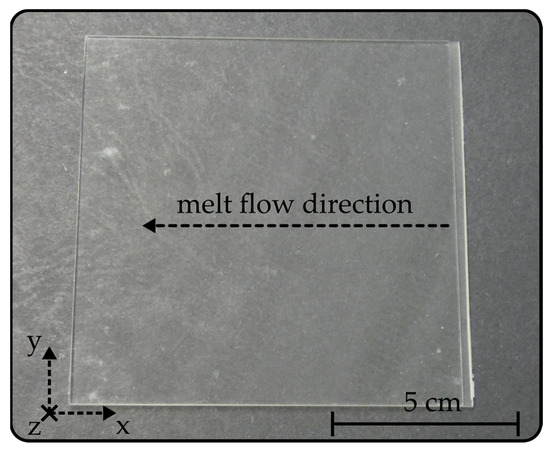 COC plates with a quadratic footprint of 100 × 100 mm² and a thickness of 1.5 mm were manufactured with an injection-molding machine (DEMAG ergotech 100/420-310s, Sumitomo (SHI) Demag Plastics Machinery, Schwaig, Germany) from the thermoplastic wrought material (TOPAS 6017S-04, TOPAS Advanced Polymers, Raunheim, Germany). The production of the plates was carried out at a melt temperature of 280 °C and an average mold temperature of 150 °C. The pellets were plasticized at a screw speed of 150 rpm and a back pressure of 8 MPa. Mold filling via a cold runner system with a film gate, in a time frame of 0.9 s, resulted in an injection pressure of 71.3 MPa. In relation to this, the holding pressure was graded over a time frame of 10 s. The cooling time in the process was 25 s and the overall cycle time amounted to 48 s. The final COC plates exhibited a high-gloss surface with a mean surface roughness of 10 nm, as confirmed by white-light interferometry (ContourGT, Bruker, Billerica, MA, USA). An exemplary image of an injection-molded COC plate is shown in Figure 1. Smaller samples with application-oriented geometries were cut from the COC plate by means of a micro mill (CNC Mini-Mill/4, Minitech Machinery, Norcross, GA, USA). Based on the employed parameters, a mean area surface roughness of 200 nm can be reached with circumferential milling processes [14].